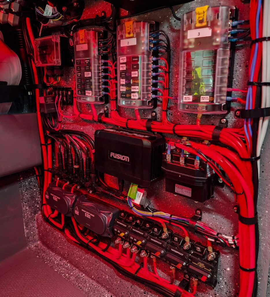 Hella doesn’t do COB lights or strip lights so Moose suggested a new brand he brings in called Shadow-Caster. The Shadow-Caster RGB light strips are housed in a thick silicone tubing that acts as a diffuser and makes them highly durable. We put these under the toe holds where they can be knocked by larger feet tucking right in, so this design is tough and a very effective lighting solution for the floor of the cockpit. They are bright and run the full length of the cockpit, giving me full vision into the bilge area.  Shadow-Caster also makes an excellent RGB controller that we installed to control the RGB function on the Hella Apelo underwater lights. It’s a simple control box and rocker switch system that makes it easy to cycle through modes and colours. We used a Fusion RGB controller for the strip lights. This is controlled via a remote I keep in the glovebox, which isn’t ideal but does work very well. As I don’t really need to change the floor light colour very often it works well for me, and I have become quite partial to purple – it’s easy on the eyes at night and looks cool. Get in contact with Moose Marine here: Moose Marine