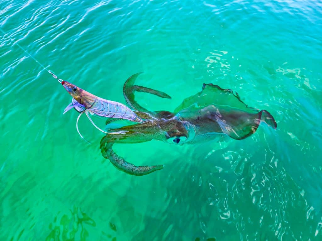 I’ve often heard it asked why some squid jigs look like prawns, and catch squid even if there are no prawns in areas such as Port Phillip Bay or Western Port and many other popular areas that squid inhabit. First off, there are shrimp of some kind in every saltwater environment; and the second – and main – answer I give is that like any animal, feeding habits are instinctive. Cephalopods will eat anything, and if southern calamari got big enough, I bet they’d eat people.