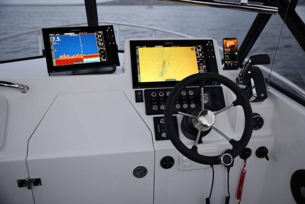 To give you an idea, I’m running dual Simrad MFDs (12in and 16in), a live well, deck wash, floodlights, underwater lights, radar, autopilot, cockpit and cabin lighting, side pocket lights, phone charger, and a downrigger. That’s a lot of current draw, and it’s not occasional use – I fish for work, not just fun, and that means I need my batteries to work just as hard as I do.