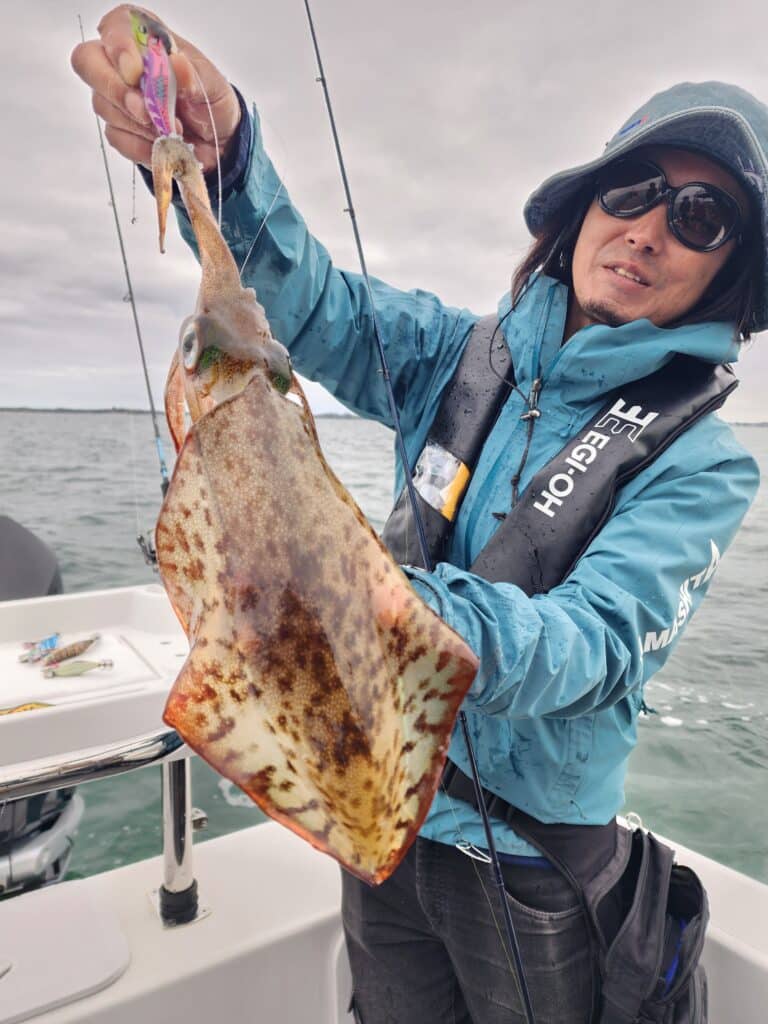 I was about 10 squid in when the current picked up, so I deployed the drogue to slow the drift. Suddenly, my rod with the K jig felt snagged for a split second—then I realized I was hooked up to a big cuttlefish. This year, I’ve caught more cuttlefish in the bay than ever before averaging two every session. This one was around 4-5kg, and Eisuke and Nobuto had never seen a cuttlefish of this size before. We were all impressed with how well the cloths on both jigs stood up to the multiple squid and the big beak of the cuttlefish.